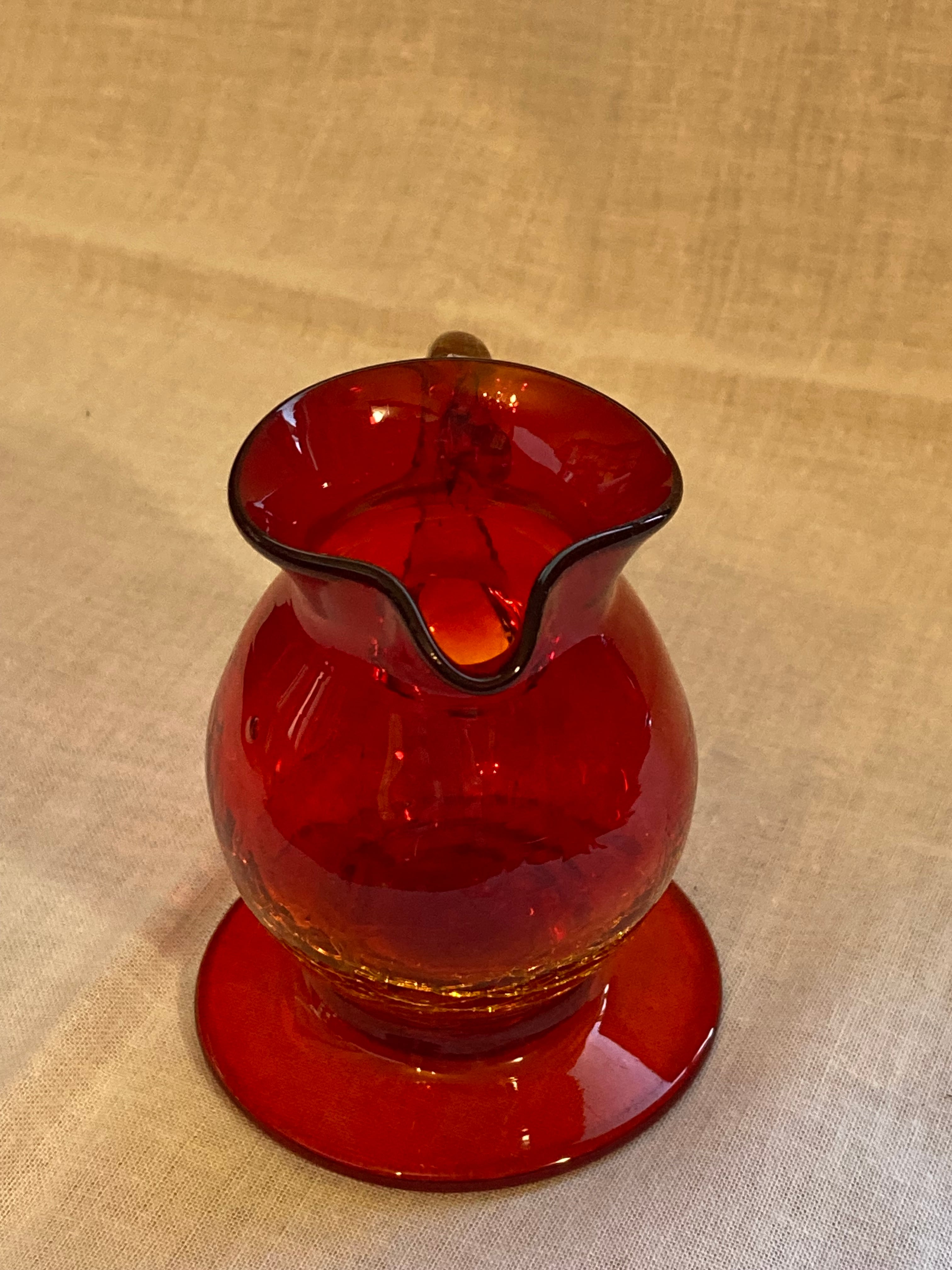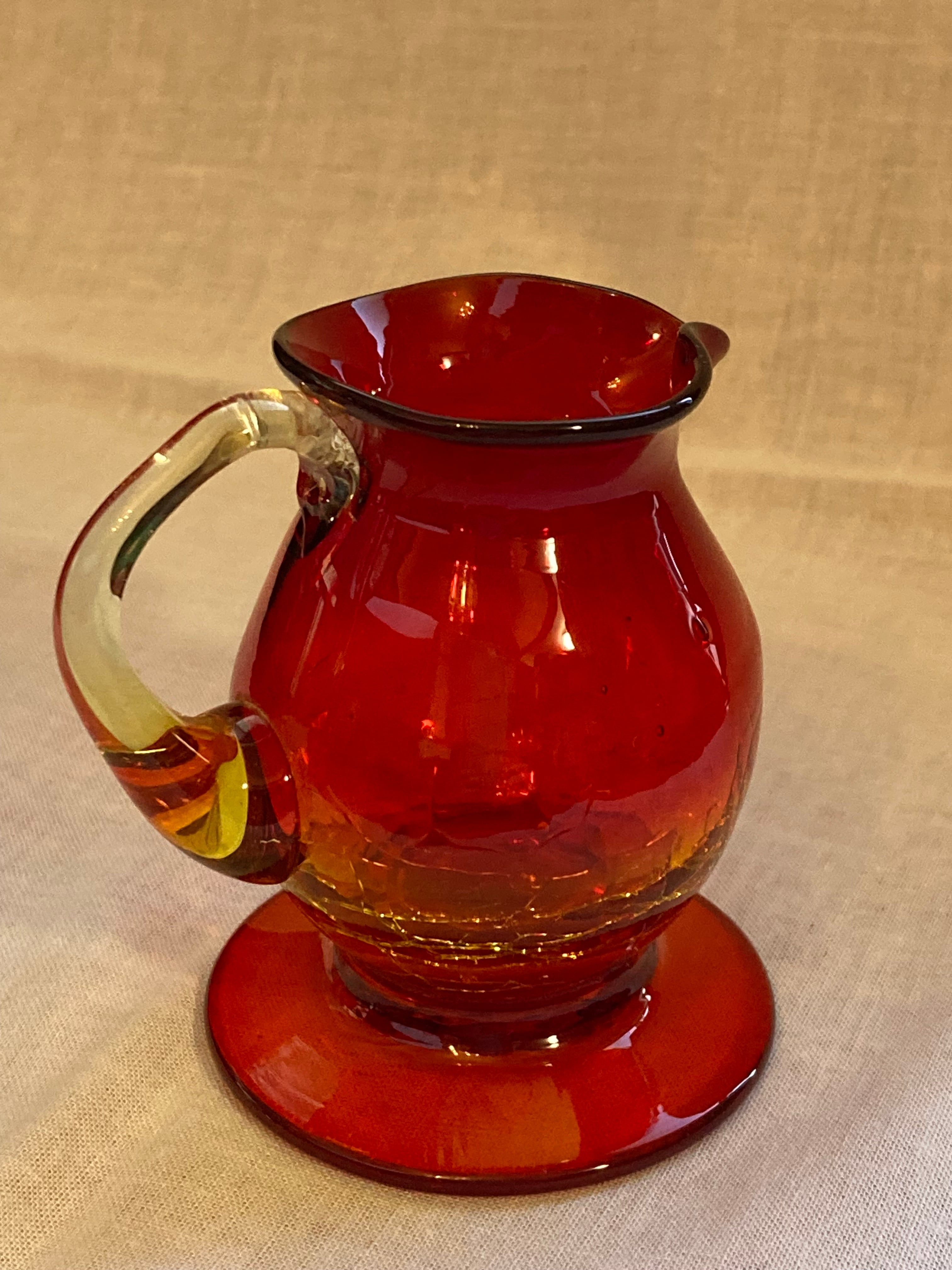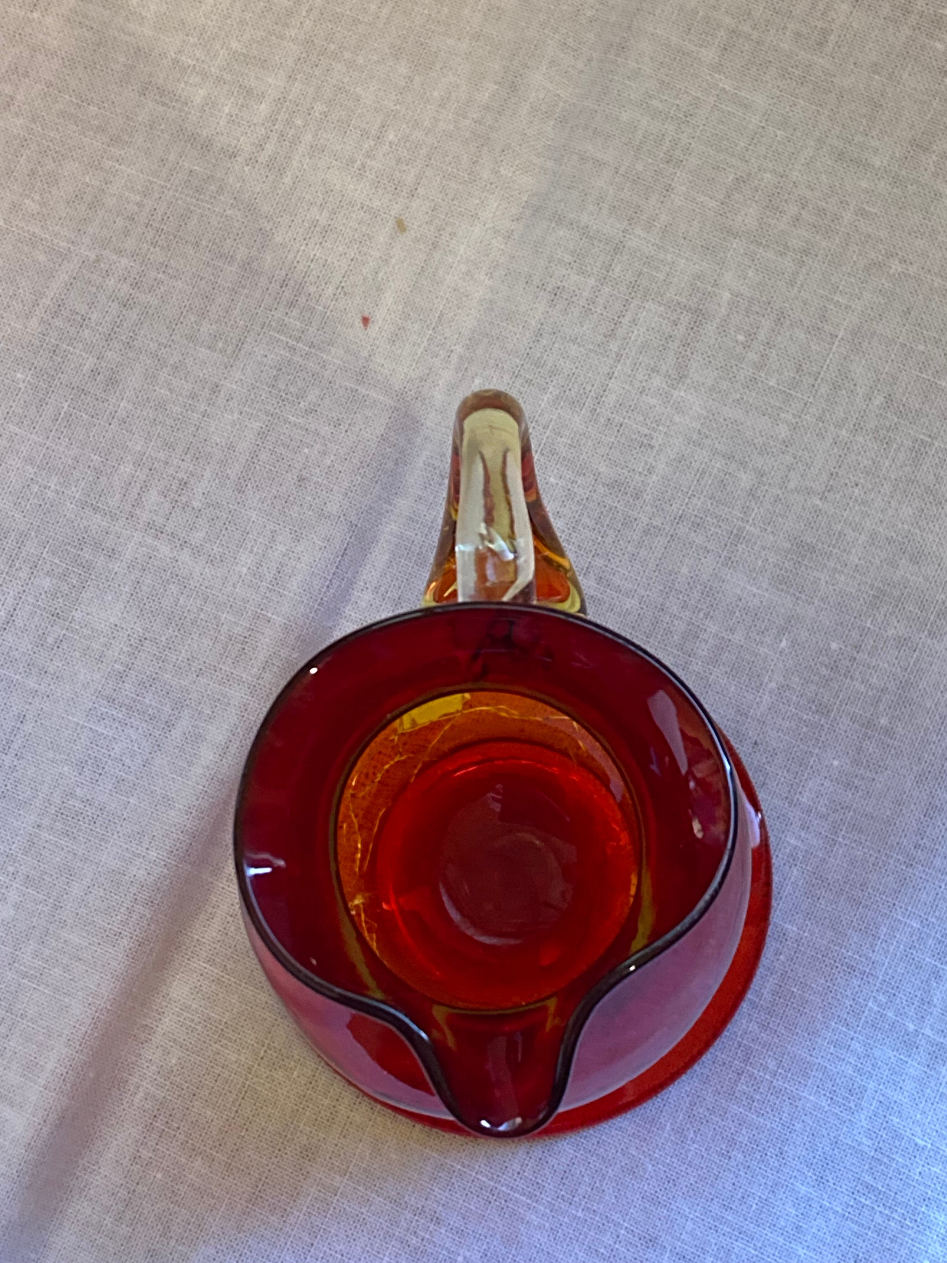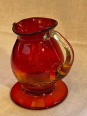 鮮やかな赤色と独特な形状が目を引くガラスのミルクポット
