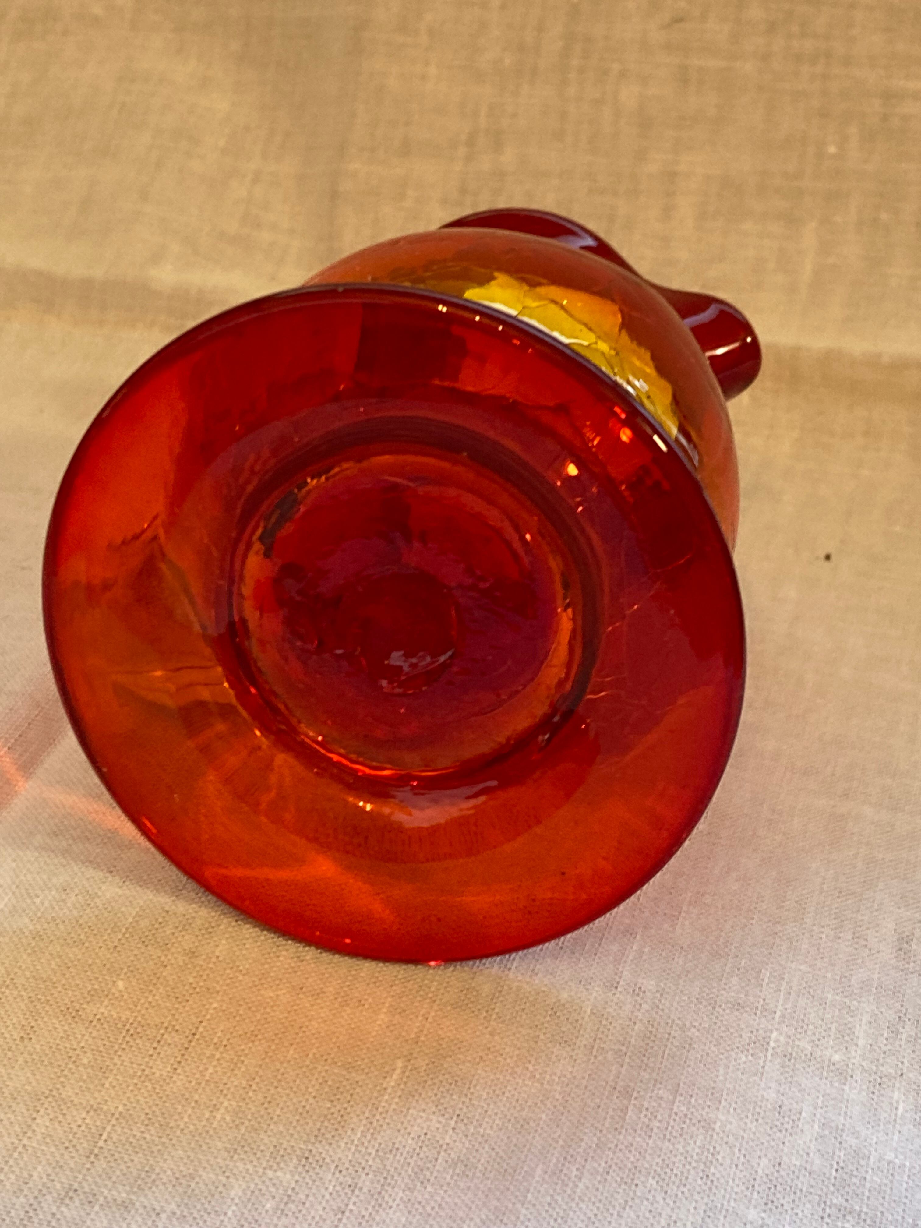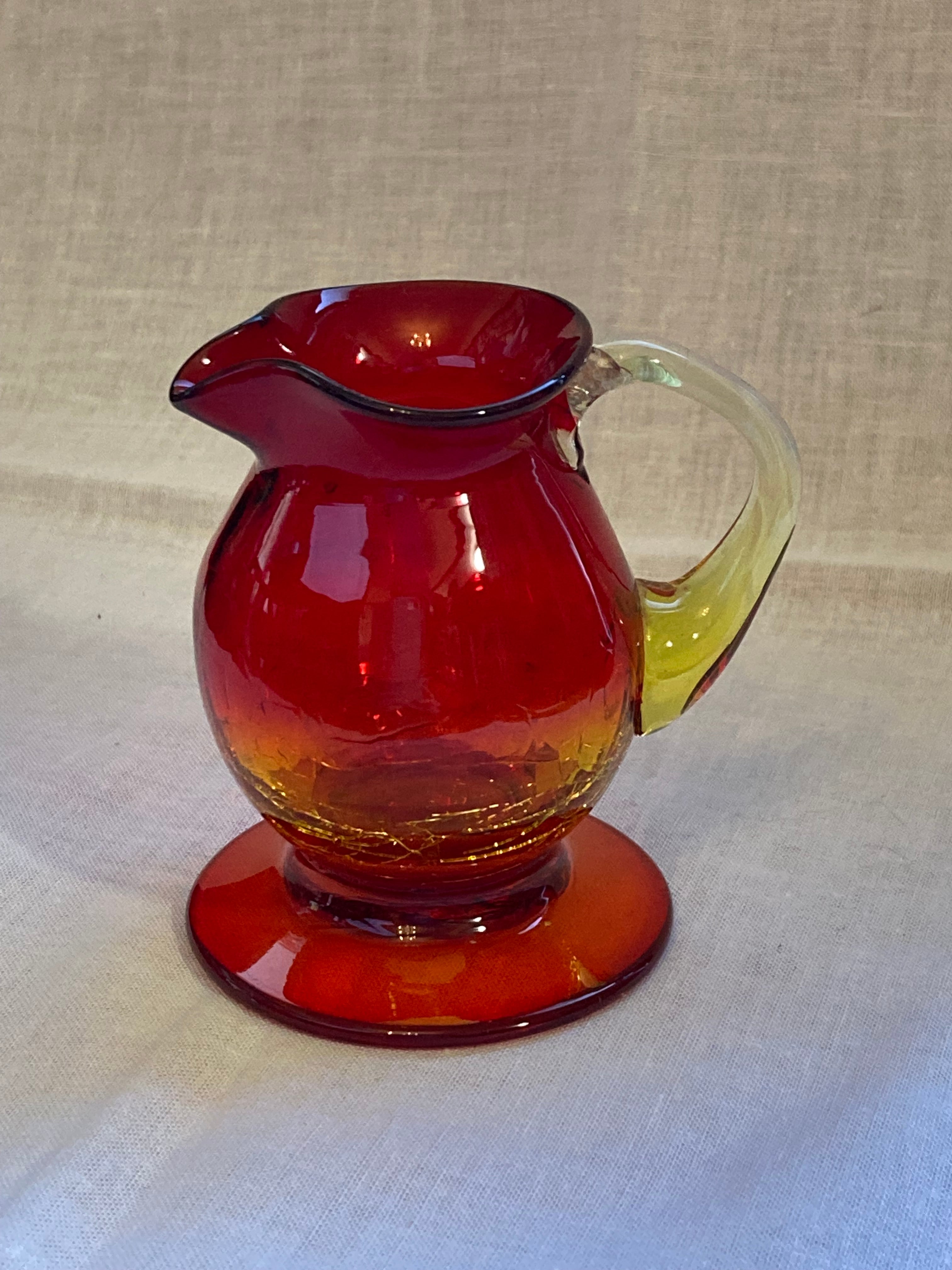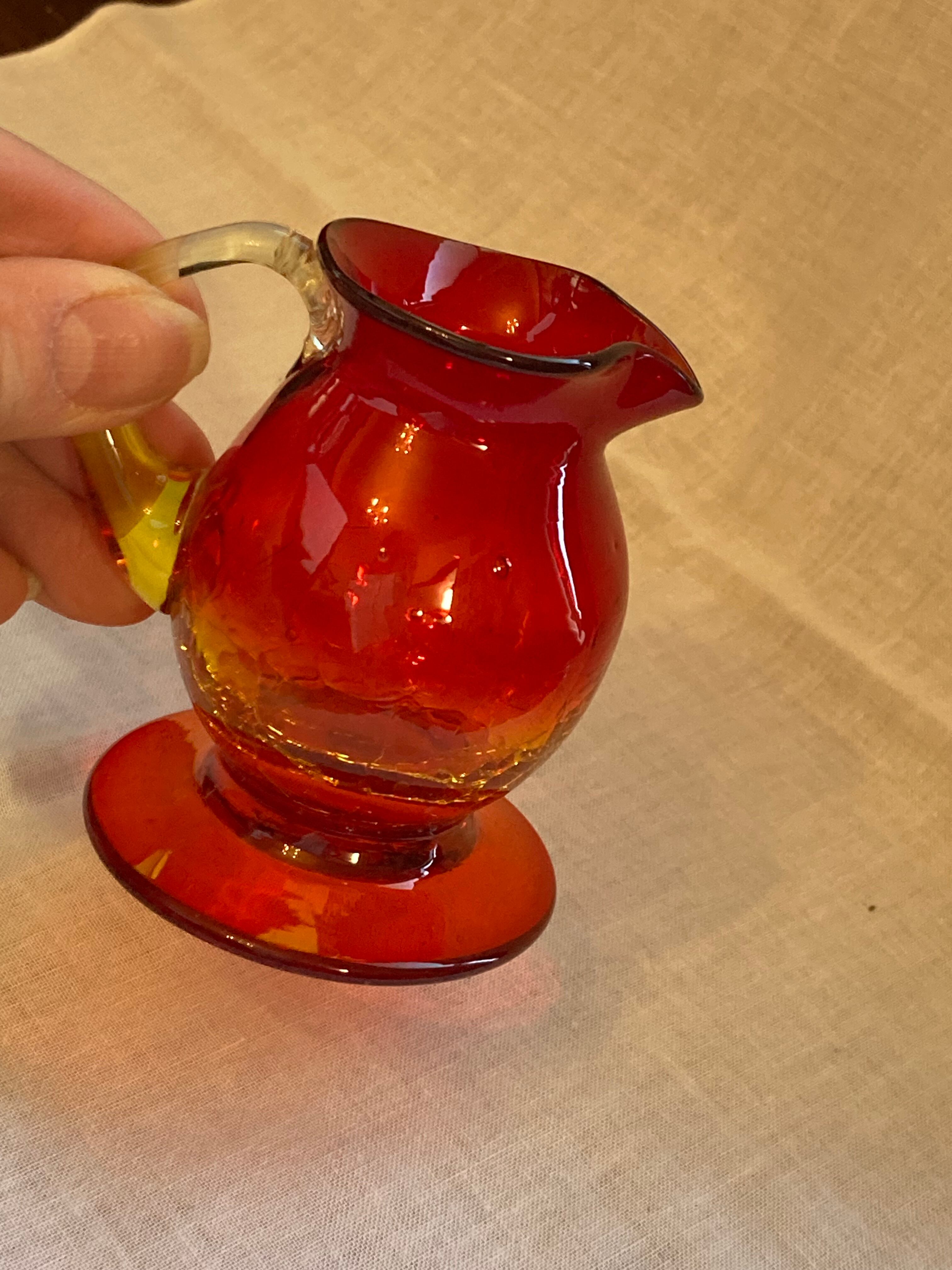 鮮やかな赤色と独特な形状が目を引くガラスのミルクポット