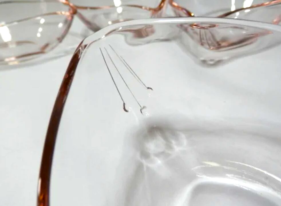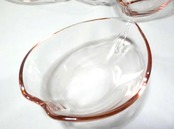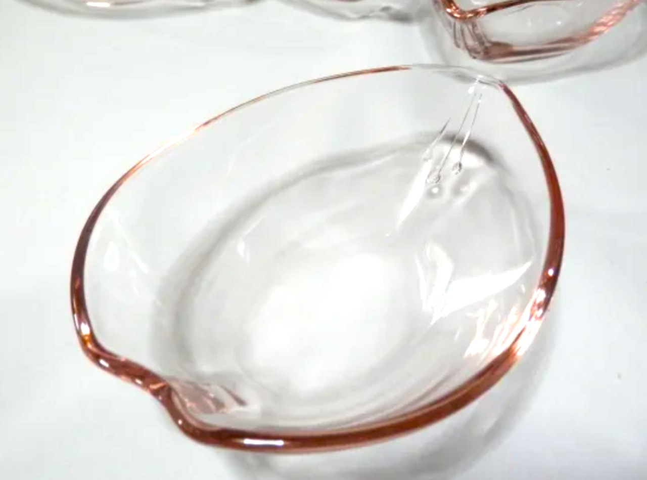 薄いピンク色のガラス、縁の絞った部分に描かれたオシベのデザインが素敵なポイントになっています
