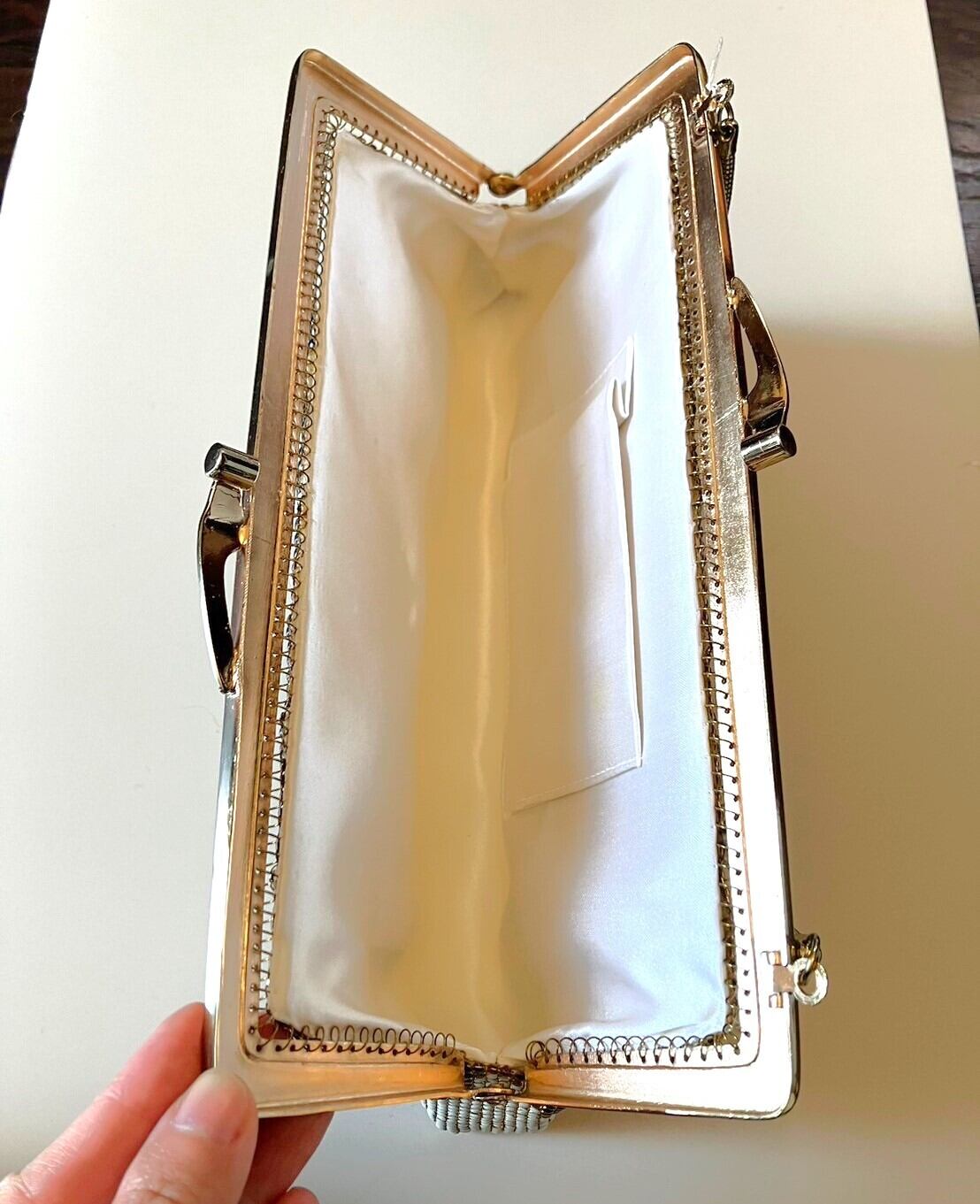 取り出し口はがま口タイプ。薄型バッグですが取り出し口は大きく開くので、荷物の出し入れはしやすそうですね。