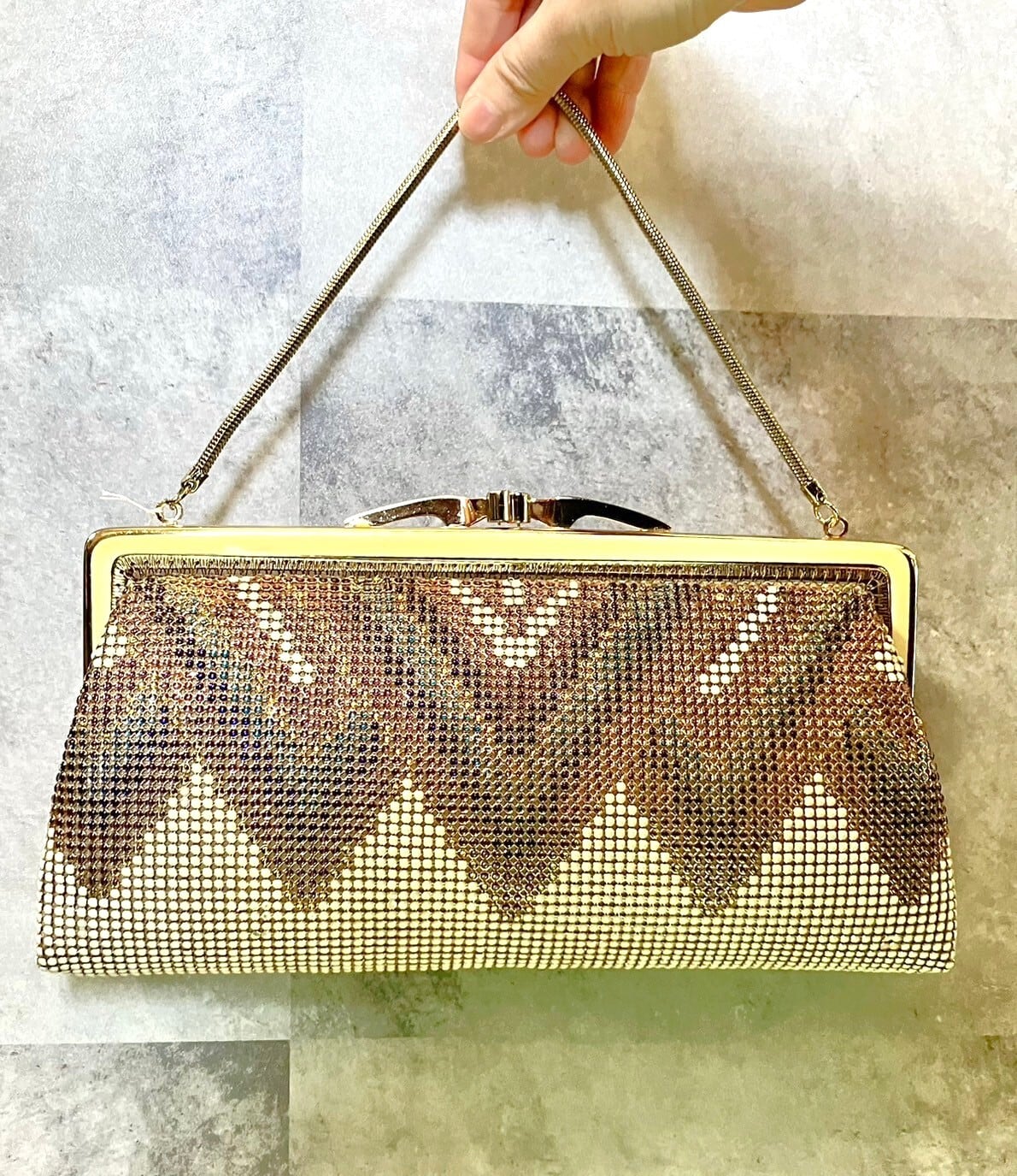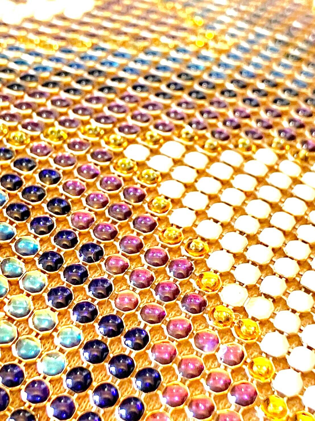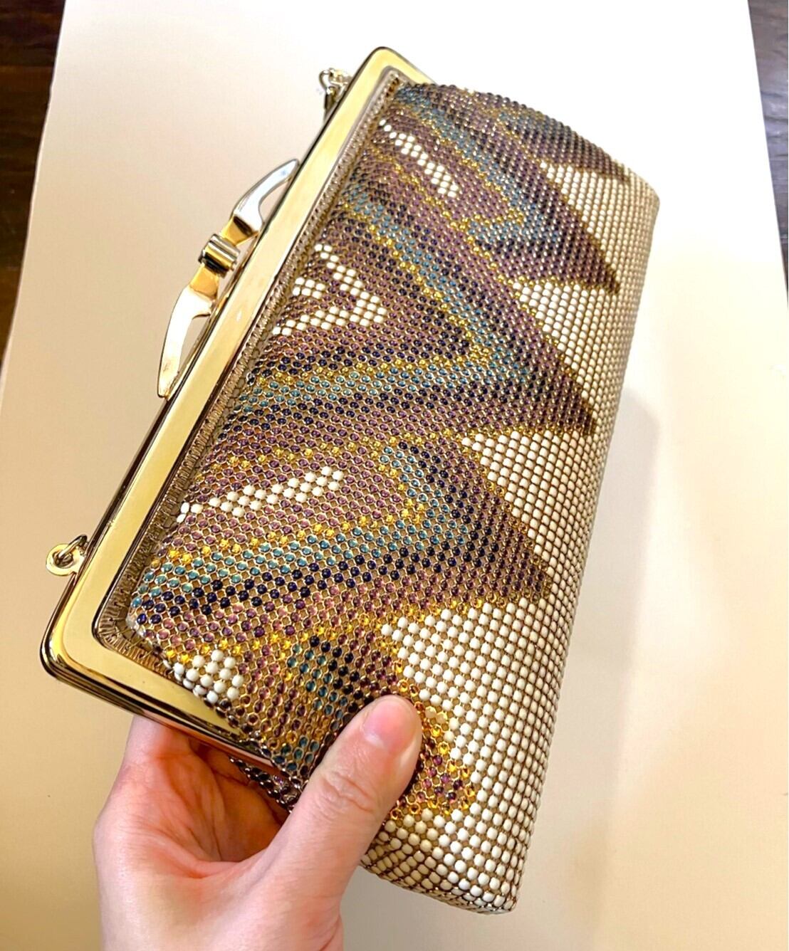 ゴールドと紫の薄型ビーズバッグ。明るい場所で見ると丸いビーズがキラキラと光ってとっても綺麗です。